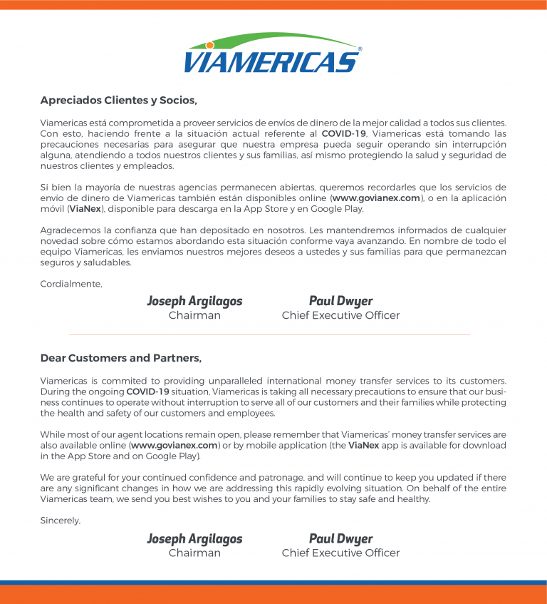 NoticiasViamericas COVID-19 Mántente informado con las más recientes actualizaciones del COVID-19 December 20, 2025 2:23 am EST Préstamos de la SBA (Small Business Administration) disponibles para tu negocio: Paycheck Protection Program (PPP) Economic Injury Disaster Loan (EIDL) Express Bridge Loan (EBL) ¿Ya te vacunaste? Planifica tu Vacuna Todo lo que necesitas saber sobre conseguir la vacuna contra COVID-19, incluyendo las reglas específicas para tu localidad. Conoce más Esta página será su fuente principal de información donde podrá encontrar las últimas actualizaciones y recursos que Viamericas le ofrece como medidas de contingencia durante el brote de Coronavirus (COVID-19). ATENCIÓN:Banco de Occidente en Honduras brinda la opción a los beneficiarios con remesas pendientes de cobro en ventanilla de depositar la remesa directo a su cuenta bancaria.Conozca más detalles aquí SBA Préstamos por Desastre Guía para solicitar préstamos por desastres ofrecidos por la Agencia Federal de Pequeños Negocios Señalización para su Negocio Diferentes avisos que puede colocar dentro y fuera de su negocio para mantener seguros a sus empleados y clientes. Actualizaciones en Pagadores Conozca los cambios más recientes en los puntos de pago por pagadores CDC Recursos y Recomendaciones Guías y Recomendaciones por el Centro para el Control y Prevención de Enfermedades Comunicados Bancarios Modificaciones en horarios de atención por algunas entidades bancarias en USA. Reduzca el Fraude de ChequesConsejos para reducir el riesgo de fraude en procesamiento de cheques. Secretaría de Salud MéxicoConsejos y Recomendaciones de Salud en español. Directorio Viamericas Directorio a los departamenos claves de la compañía.